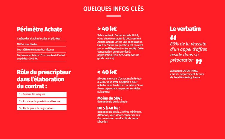 L’équipe du département Achats de Total Marketing France vous présente son kit du prescripteur achats. Un projet construit collectivement par l’équipe Achats, soucieuse d’apporter plus d’efficacité et de méthode aux métiers et process Achats. Ce guide donnera aux prescripteurs, au travers de fiches pratiques et d’illustrations, les clés pour optimiser leurs achats tout au long du processus, tout en prenant en compte les règles Achats à respecter.
