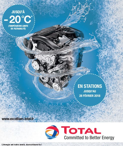 Jusqu’au 28 février 2018, TOTAL EXCELLIUM DIESEL devient TOTAL EXCELLIUM DIESEL GRAND FROID dans plus de 800 stations TOTAL, TOTAL Access et ELAN du grand-Est de la France. Avec une température limite de filtrabilité (TLF) de -20°C(1) (contre -15°C pour un carburant standard), TOTAL EXCELLIUM DIESEL GRAND FROID permet de mieux démarrer son moteur lors de basses températures.