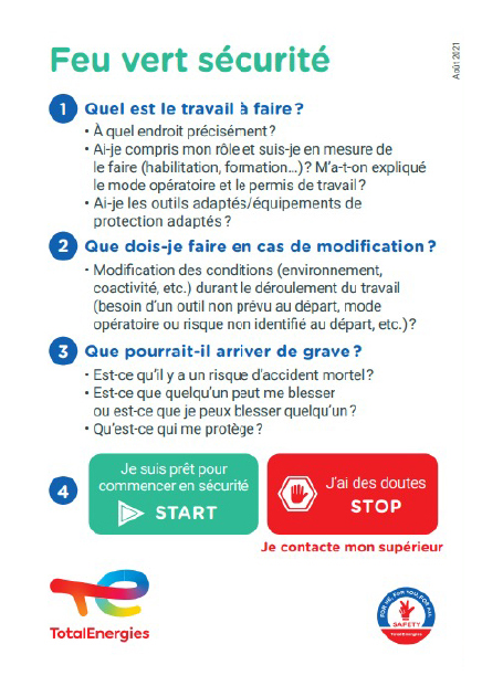 Le Feu vert sécurité devient un feu rouge sécurité (= Stop Card) si l’un des intervenants a un doute ou que l’environnement a changé par rapport à la préparation des travaux.