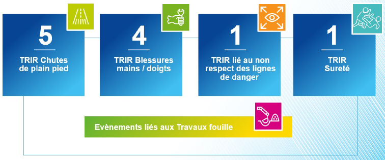 Cet accident mortel s’inscrit dans le prolongement des chiffres préoccupants qui ont marqué l’année 2022 sur le plan de la sécurité, avec 5 accidents du travail (vs. 1 AT en 2021) et un TRIR Travaux atteignant 3,91 (vs. 1 en 2021) sur le périmètre DCM.
