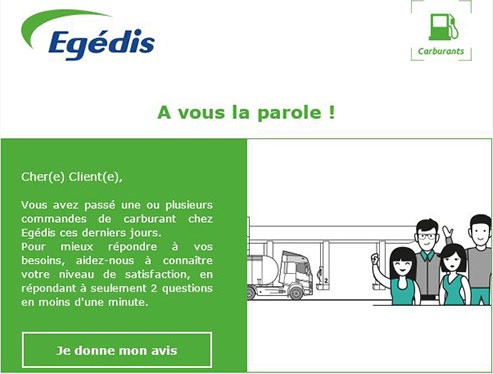 - Le questionnaire nouveau client envoyé trois mois après la première commande. L’occasion de s’assurer que la relation commerciale a bien démarré, que la première livraison de carburant s’est correctement passée, d’évaluer la connaissance des services proposés par Egédis et la satisfaction globale en s’appuyant sur les points forts et points