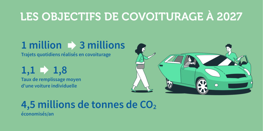 Le 13 décembre 2022, le Gouvernement a lancé le « Plan national de covoiturage du quotidien ». Il affiche un objectif de triplement du nombre de trajets réalisés en covoiturage d’ici 2027, soit une économie de 4,5 millions de tonnes de CO2 /an.