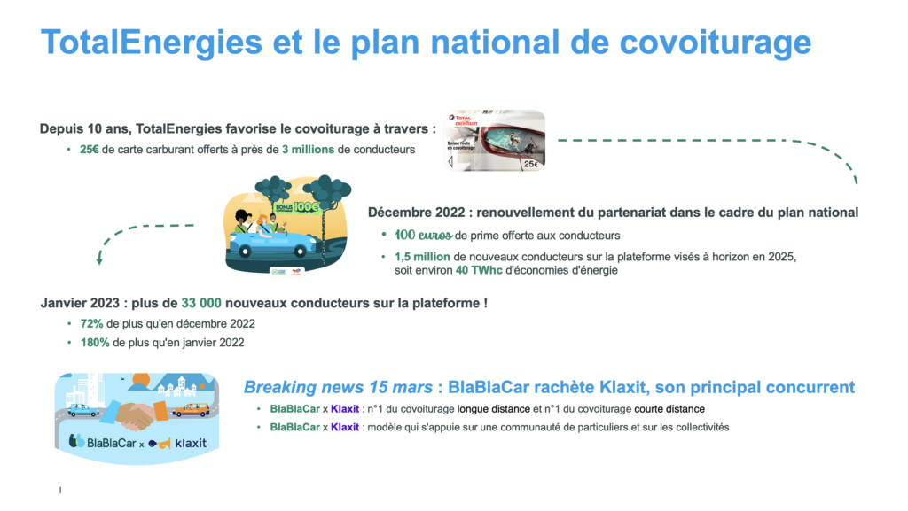 Pour participer à l’atteinte de ces objectifs, TotalEnergies signe un accord de partenariat avec BlaBlaCar, pensé pour valoriser les économies réalisées par les covoitureurs.