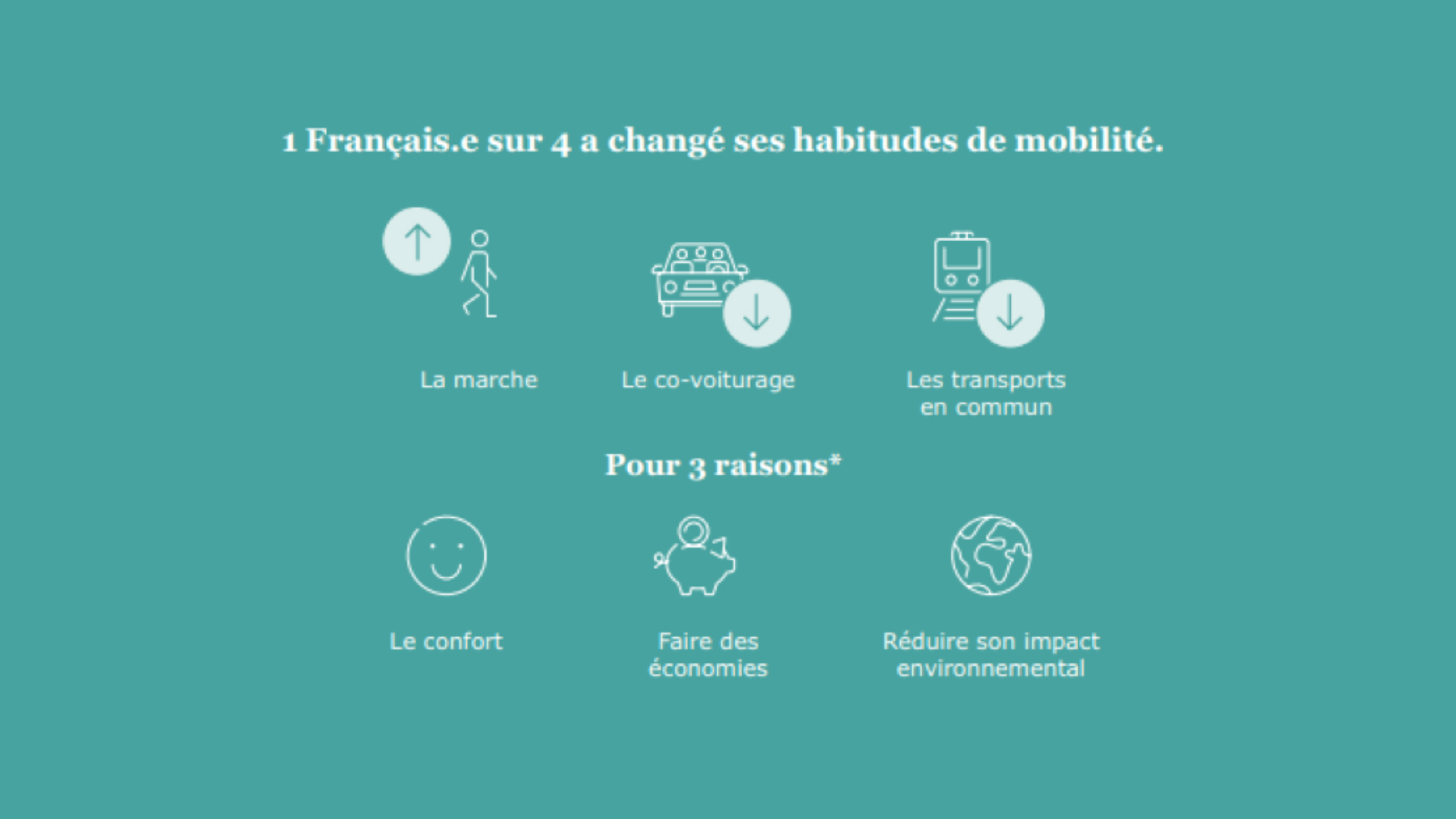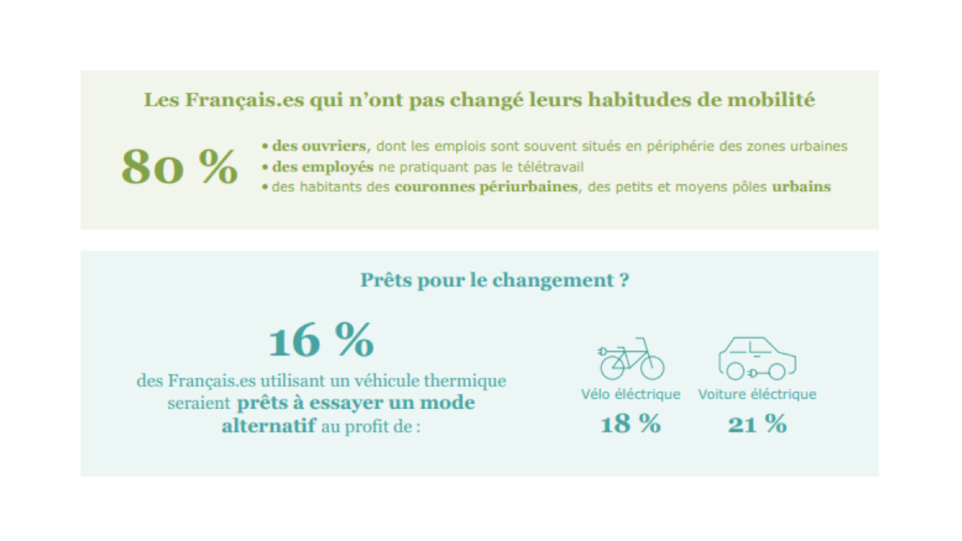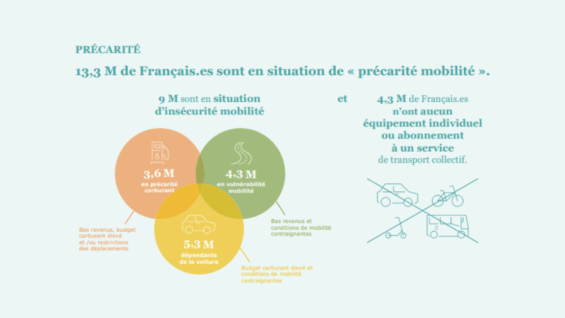 Les résultats sont interpellants : 13,3 millions de personnes sont en situation de précarité en matière de mobilité, soit, plus de 27% de la population âgée de plus de 18 ans. Parmi eux, 4,3 millions n’ont aucun équipement individuel ou abonnement à un service de transport collectif. Les 9 millions restants sont en situation d’insécurité mobilité, qui se traduit sous la forme de dépenses élevées en carburants, de mobilités contraignantes, de difficultés à remplacer un véhicule vieillissant ou encore, d’absence d’alternative à la voiture. Néanmoins, une autre donnée est encourageante, 1 Français sur 4 a aujourd’hui changé ses habitudes de mobilité entre 2020 et 2022 !