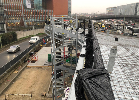 Sur le chantier de reconstruction de la station-service de la Porte d’Aubervilliers à Paris, un escalier de chantier en colimaçon a été installé pour faciliter et sécuriser l’accès à la toiture.