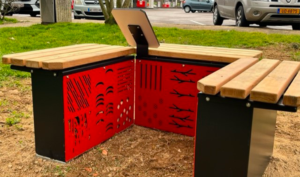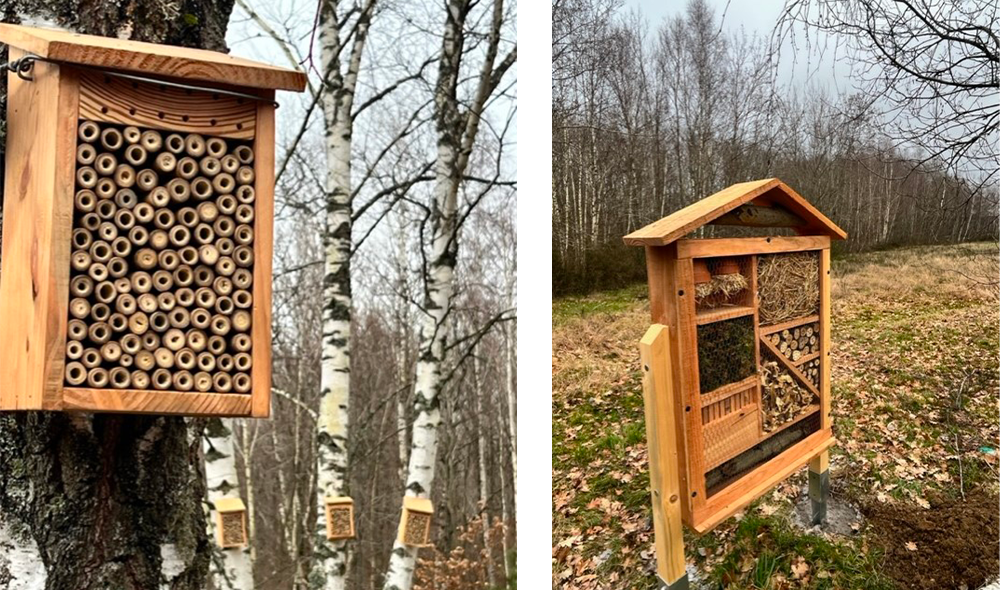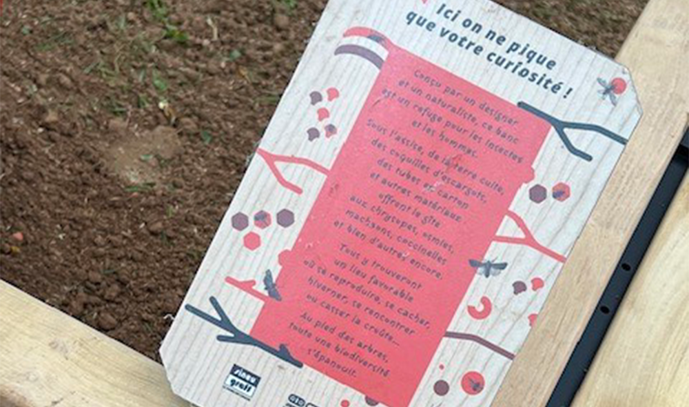 Enfin, les hôtels à insectes attirent beaucoup l’attention des clients qui s’offrent une pause nature à l’écart de l’autoroute. Nous avons installé deux grands hôtels, quatre autres plus petits et trois bancs à insectes du côté de l’aire de pique-nique. Ces derniers sont la convergence de toutes les curiosités, il est amusant de regarder les clients se pencher pour guetter les insectes qui déambulent dans le réseau de galeries !