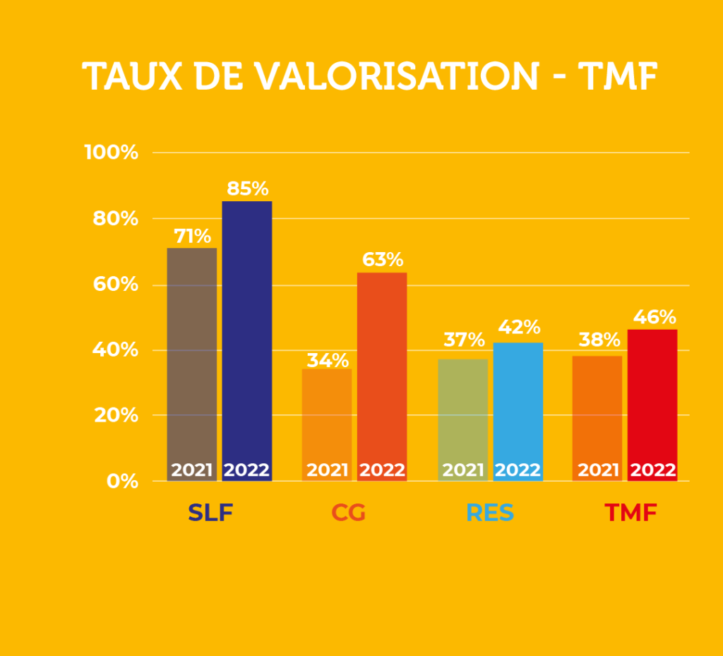 Le taux de déchets recyclés ou valorisés* a augmenté en 2022 par rapport à l’année passée. Ceci va dans le bon sens pour atteindre l’objectif de TMF : 70% de déchets recyclés ou valorisés à horizon 2030. L’objectif HSEQ 2022 de réaliser +6% de déchets d’exploitation recyclés/valorisés a été atteint par rapport à 2021.