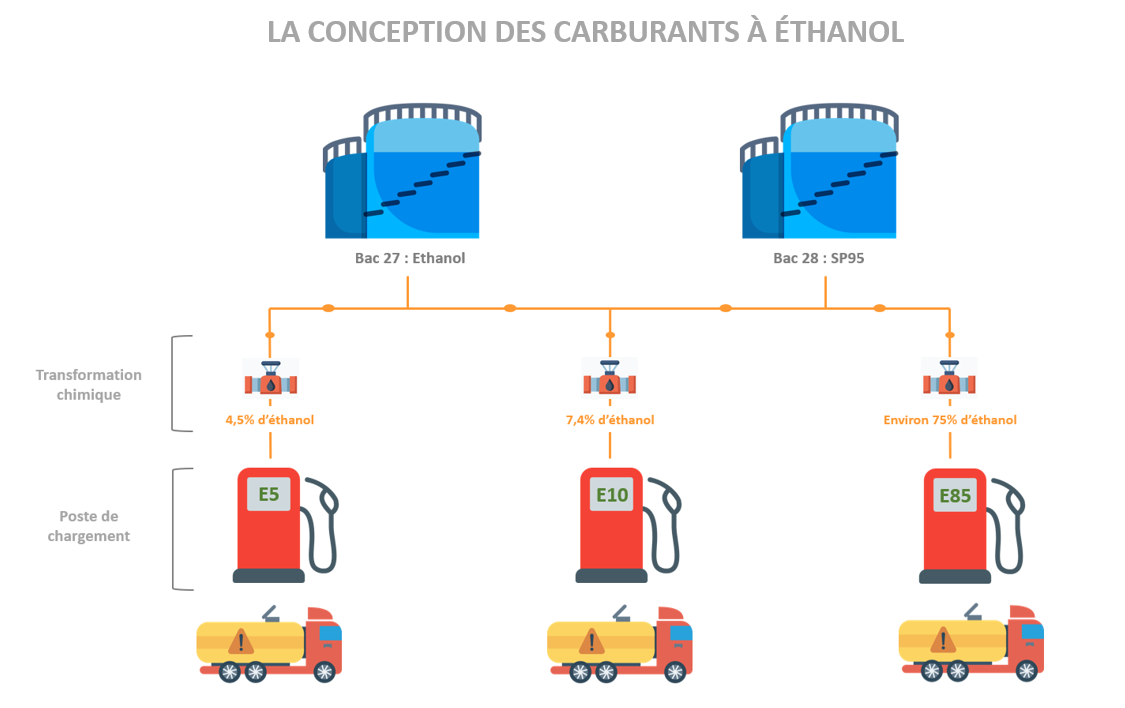 Pour concevoir ce carburant, il faut incorporer 85% d’éthanol dans du SP95. Le mélange se fait sur le poste de chargement du dépôt : lorsqu’un de nos client vient se procurer en carburant éthanolé, il branche son camion sur un tuyau qui relie les bacs d’éthanol et de SP95. Suivant le pourcentage d’incorporation d’éthanol, on obtient de l’E5, de l’E10 ou de l’E85.