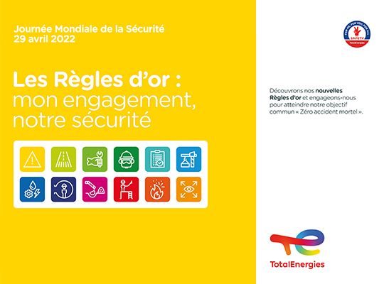 La prochaine Journée Mondiale de la Sécurité (JMS) de TotalEnergies se déroulera le 29 avril 2022 et aura pour thème « Les Règles d’or : mon engagement, notre sécurité ».