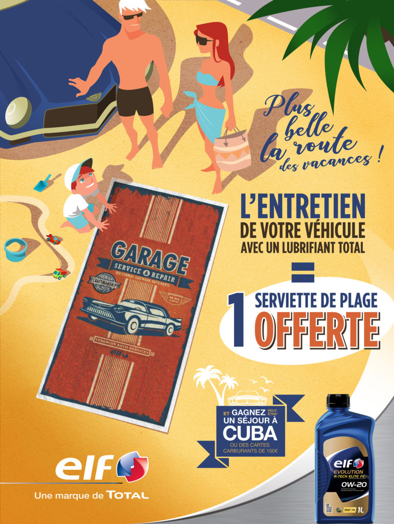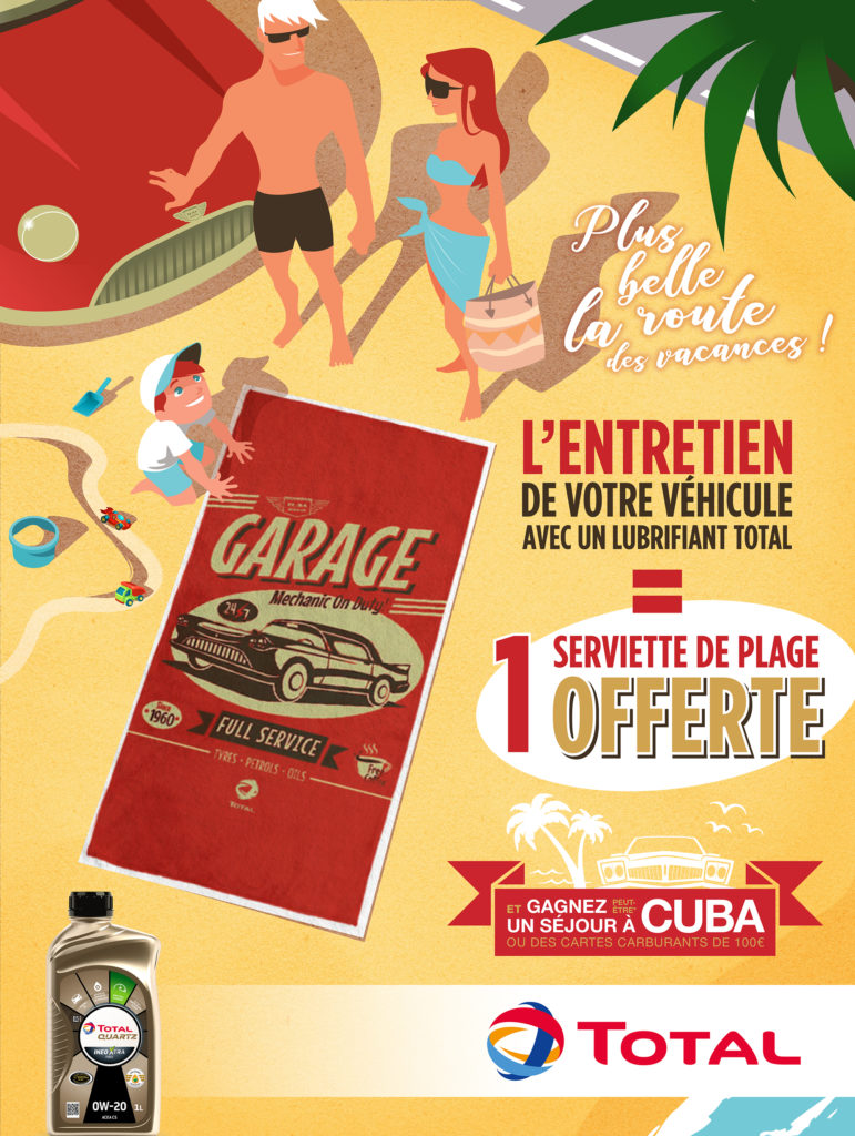 Un grand jeu a été organisé : un séjour à Cuba ou des cartes carburant JUBILEO d’une valeur de 100€ étaient à remporter ! Pour l’entretien du véhicule d’un client avec un lubrifiant TOTAL ou ELF, 1 serviette de plage était offerte (voir les affiches ci-contre).