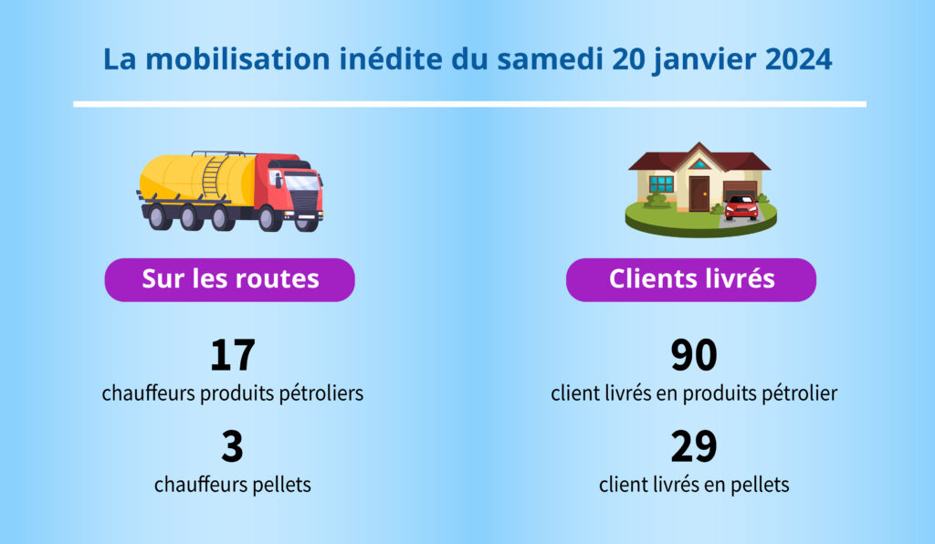 Une fois la météo revenue au beau fixe et les interdictions de circulation levées, une mobilisation exceptionnelle s’est organisée le samedi 20 janvier 2024. Ce jour-là, 20 chauffeurs-livreurs ont répondu présents pour honorer