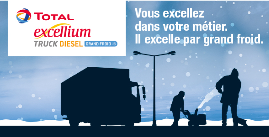Mais ce n’est pas tout, Total adapte aussi son carburant pour les poids lourds en proposant TOTAL EXCELLIUM Truck Diesel Grand Froid. Un dispositif de communication là aussi bien rodé avec une nouvelle campagne d’affichage « Vous excellez dans votre métier. Il excelle par grand froid. » médiatisée sur Linkedin et total.fr.
