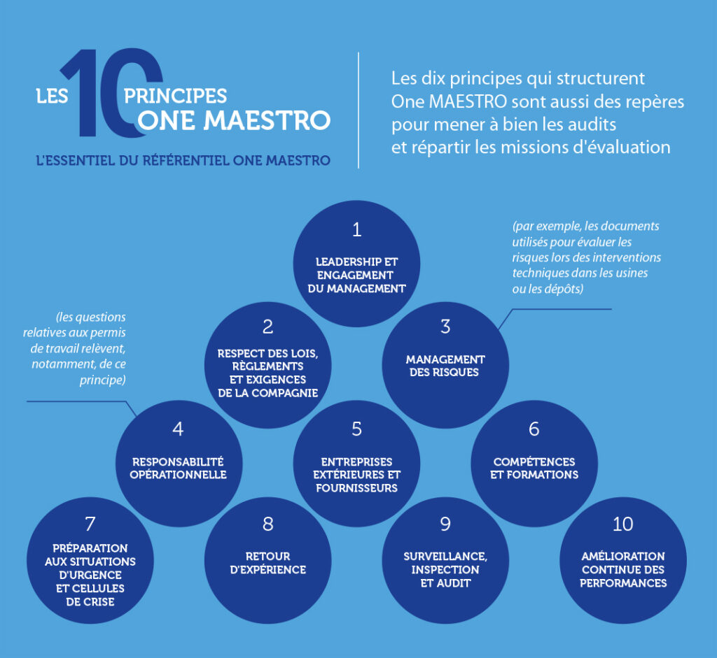 Olivier PITIOT : À l’échelle de la Compagnie, One MAESTRO s’applique à toutes les filiales ainsi qu’aux sites qu’elles opèrent. Il repose sur 10 principes fondamentaux (voir en encadré) déclinés en 55 attentes. L’objet des audits HSE est d’évaluer la bonne application des Règles HSE de la Compagnie ainsi que l’état d’avancement des plans d’action correspondant à chacune de ces attentes.