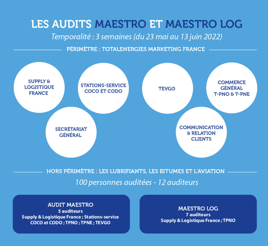Pour ce qui concerne TotalEnergies Marketing France, le premier cycle d’audit Maestro a eu lieu en 2017-18. Les entités concernées étaient principalement, Supply & Logistique France (SLF) ainsi que les stations des réseaux COCO et CODO.