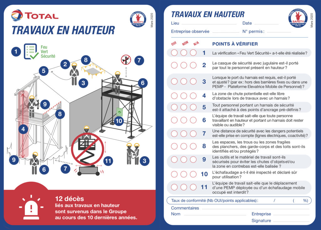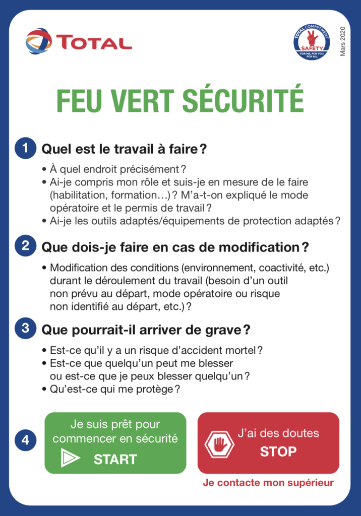 Enfin, les “vérifications qui sauvent la vie”… Cette action consiste à pouvoir contrôler sur le terrain, d’un simple coup d’œil, que les opérations à risques sont réalisées dans le respect des règles HSE. Les contrôles sont à réaliser par le management, les responsables HSE terrain, les superviseurs de Total ainsi que leurs homologues des Entreprises intervenantes. Comme nous ne sommes pas tous des spécialises des opérations à risques, des cartes résumant les incontournables de ces opérations, avec dessins et checklists, sont à notre disposition.