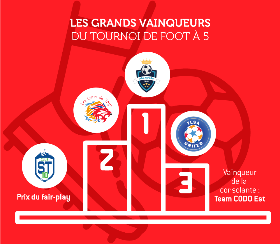 Côté foot, après un match final de très haut niveau ce sont les ALL STARS qui remportent le tournoi contre les Lyon de TMF 2, succédant ainsi au palmarès à TLSA United. Félicitations à STEDIS, l’équipe gagnante du prix du Fair-Play, au grand vainqueur et aux deux équipes qui complètent ce beau podium !