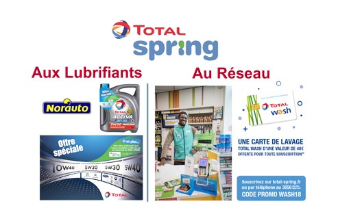 Côté Lubrifiants France, le département Grande Distribution lance l’opération « Box de Norauto » du 20 juin au 23 août. « L’idée est de compléter le dispositif de communication et de recrutement de Total Spring en relayant massivement l’offre sur une opération de grande envergure chez le leader des centres-auto », explique Julien BOUCLY, responsable Marketing Opérationnel Grande Distribution. Ainsi pour toute souscription à l’offre Total Spring, le consommateur se verra rembourser son bidon de lubrifiant 5 litres. « En cas de succès commercial, nous pourrons proposer cette mécanique à d’autres grandes enseignes nationales alimentaires afin d’accroître encore davantage la visibilité de l’offre », ajoute Paul-Hubert FRANCOIS, chef de département Grande Distribution.