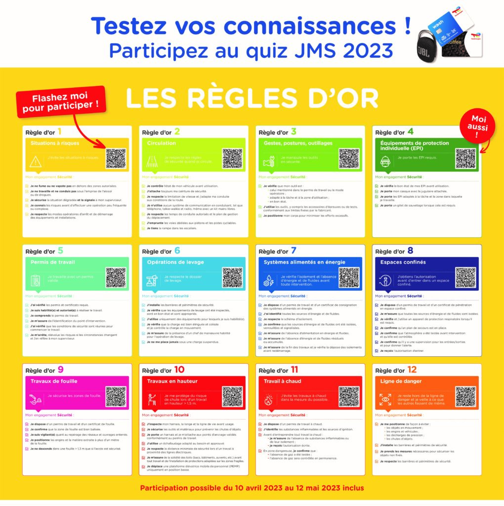 Aussi, parmi les animations proposées et à l’occasion de la fin du déploiement des Règles d’or, nous organisons un Grand Jeu « Règles d’or » sur la période du 10 avril au 12 mai 2023.